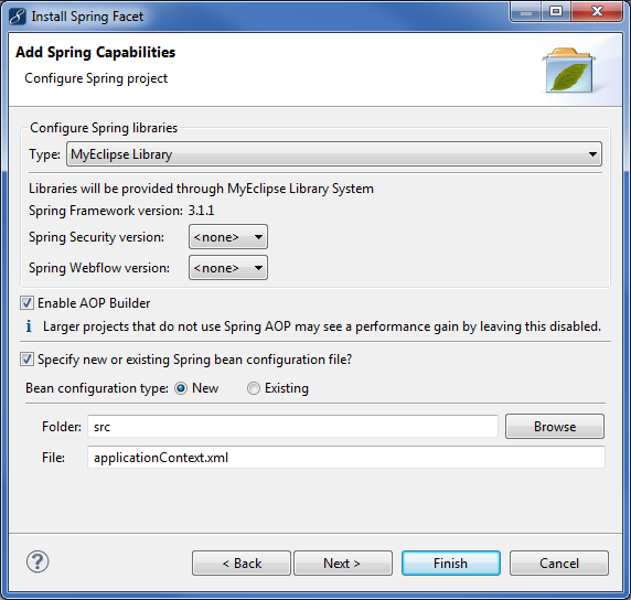 MyEclipse將創建一個新的applicationContext.xml文件。點擊完成。