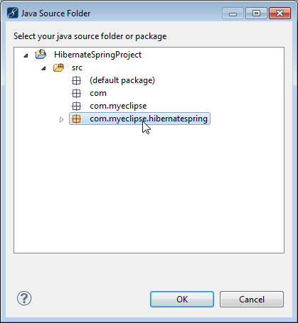 單擊Java src文件夾旁邊的瀏覽,展開 HibernateSpringProject > src,選擇com.myeclipse.hibernatespring,然后單擊確定。