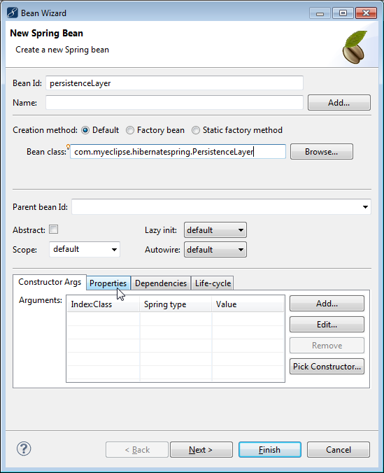 輸入持久層的Bean的標識字段,然后輸入在Bean類字段中的com.myeclipse.hibernatespring.PersistenceLayer。