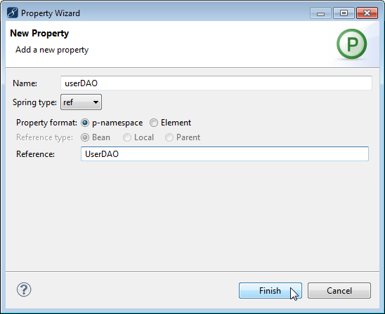 在“Name”字段中鍵入userDAO,從“Spring Type”下拉列表中選擇ref,在“Reference”字段中輸入UserDAO,然后單擊“完成”。