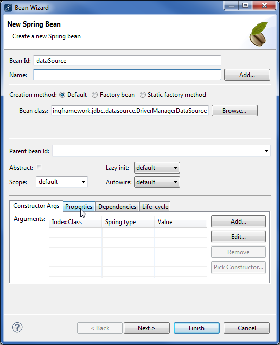 在“Bean Id”字段中輸入dataSource,并在“Bean class”字段中輸入org.springframework.jdbc.datasource.DriverManagerDataSource。