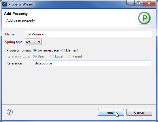 在“Name”字段中輸入dataSource,將Spring類型保留為ref,在“Reference”字段中輸入dataSource。