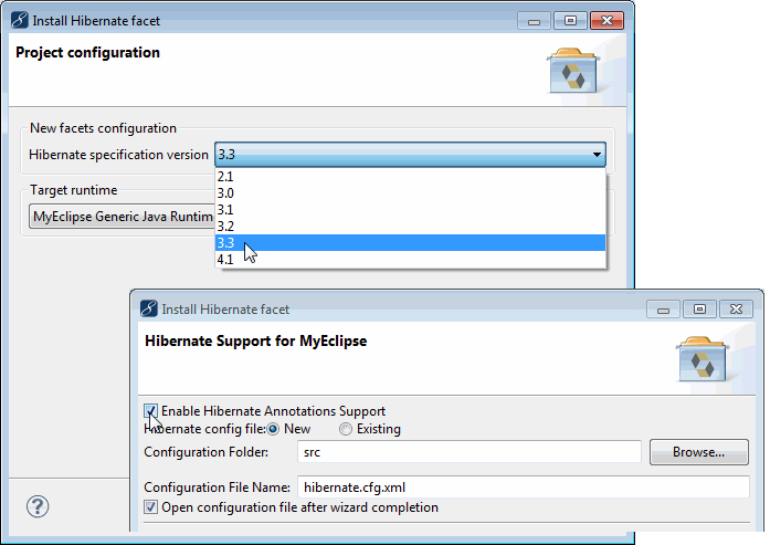 注意:為了在逆向工程過程中為Hibernate 3.x提供注釋支持,必須在Active Configuration File字段中選擇Hibernate配置文件,或者為SessionFactory選擇Spring bean配置文件和 AnnotationSessionFactoryBean。
