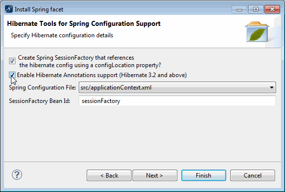 在第3頁上添加Spring功能時,請選中“Enable Hibernate annotation support”復選框。這將創建一個AnnotationSessionFactoryBean,而不是LocalSessionFactoryBean。在使用注釋時,AnnotationSessionFactoryBean是必需的。