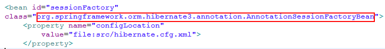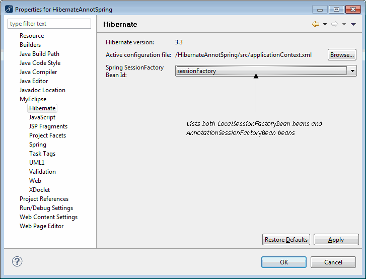 當您選擇Spring bean配置文件時,使用上述過程的項目設置中的Hibernate項目屬性頁會在SessionFactory Bean ID下拉列表中同時列出LocalSessionFactoryBean bean和AnnotationSessionFactoryBean bean。