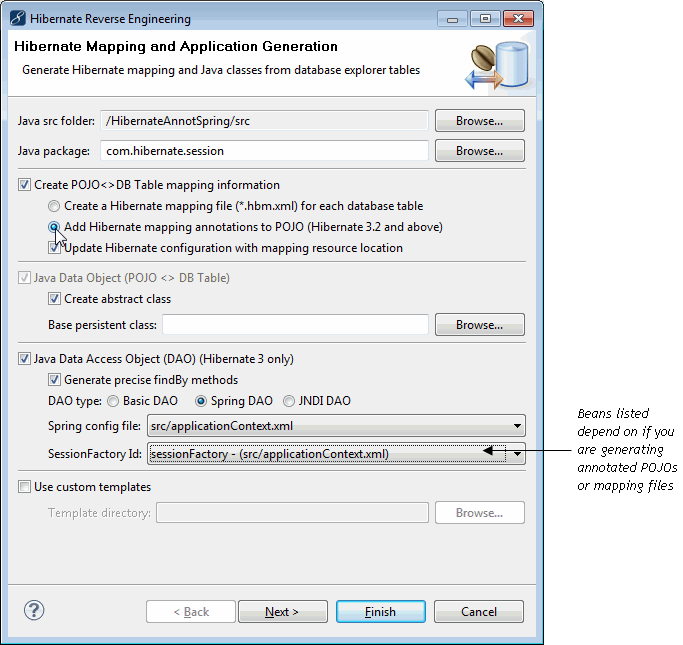 為Spring DAO提供的會話工廠bean Ids取決于您是否選擇生成帶注釋的POJO或Hibernate映射文件。如果選擇生成帶注釋的POJO,那么SessionFactory Id下拉列表中將僅顯示AnnotationSessionFactoryBeans,否則將同時列出LocalSessionFactoryBean bean和AnnotationSessionFactoryBean bean。