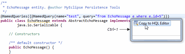 如果您正在編輯一個NamedQuery注釋,可以在查詢屬性重調用quick fix(通常為CTRL + 1)來復制到HQL Editor。這將打開HQL編輯器,并使用查詢字符串對其進行初始化。