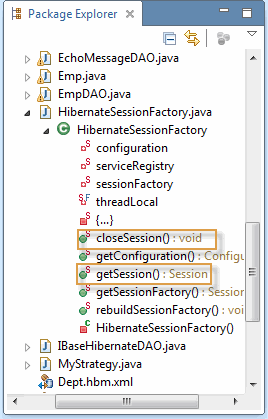 測試Hibernate持久性的一種方法是使用main方法創建Java類。測試類使用Java對象和由Hibernate向導創建的HibernateSessionFactory。查看在HibernateSession類中定義的兩個重要方法,如下所示,它們在測試代碼中使用。