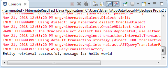 在資源管理器中右鍵單擊HibernateReadTest.java文件,然后選擇 Run > Run As > Java Application。將打開“Console”視圖,如果測試成功,您將看到如下圖所示的輸出。