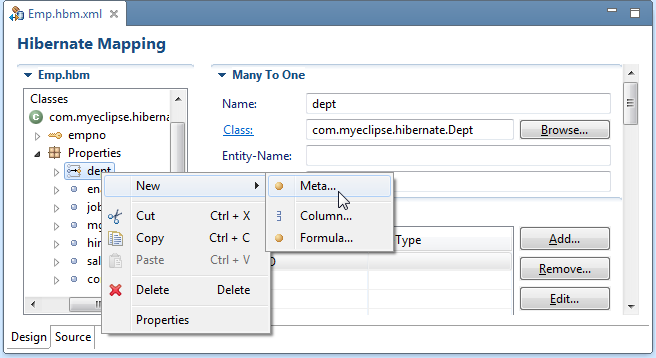 第二種類型的配置文件是映射描述(文件擴展名* .hbm),它指示Hibernate如何在特定的Java類和一個或多個數(shù)據(jù)庫表之間映射數(shù)據(jù)。MyEclipse提供了用于處理所有這些配置文件類型的工具,并在您更改數(shù)據(jù)庫和Hibernate映射的Java類時使它們保持同步。編輯器具有以下功能: