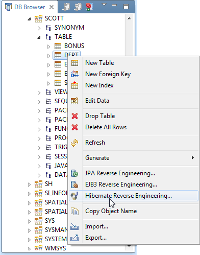 在Database Explorer透視圖中,可以查看所連接的數(shù)據(jù)庫的內容。在DB瀏覽器中,右鍵單擊要反向工程的表,然后從菜單中選擇Hibernate Reverse Engineering。完成向導后,系統(tǒng)將提示您切換到Hibernate透視圖。