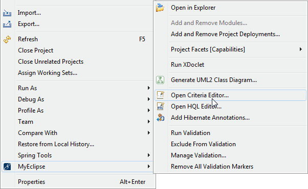 要訪問Criteria Editor,請右鍵單擊包含Hibernate facet的項目,然后選擇MyEclipse > Open Criteria Editor。