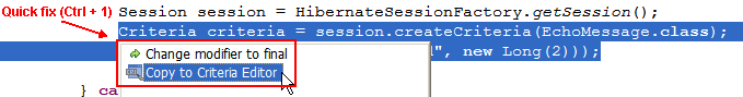 可以使用MyEclipse中的Criteria Editor來編寫和執(zhí)行任何有效的基于條件的代碼。在Java編輯器中輸入條件時,選擇它并調用快速修復將顯示“Copy to Criteria”編輯器操作。選擇此操作將打開“Criteria”編輯器,并使用所選文本進行初始化。