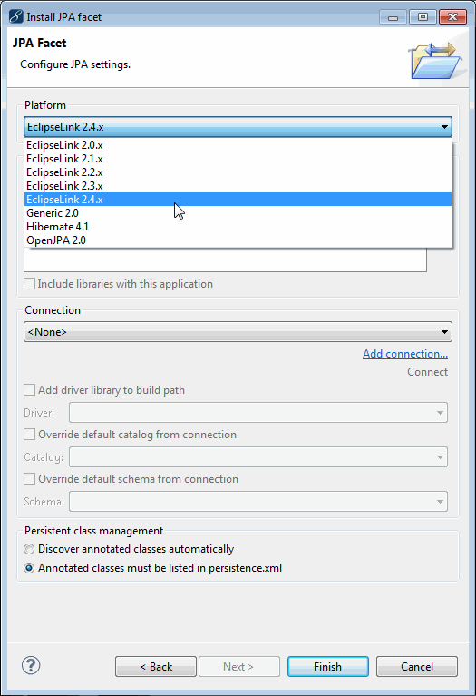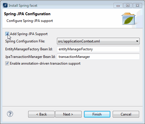 將JPA構面添加到已經具有Spring構面的項目時,您可以選擇高級Spring-JPA支持(反之亦然)。這種級別的支持使JPA工具可以與項目的Spring工件一起使用。下圖顯示了Spring-JPA項目配置向導。