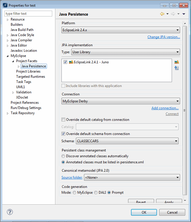同時,您還可以右鍵單擊該項目從菜單中選擇“Properties”,展開MyEclipse > Project Facets,然后選擇Java Persistence,打開Java Persistence properties頁面隨時更改JPA項目的數據庫驅動程序關聯。