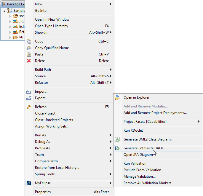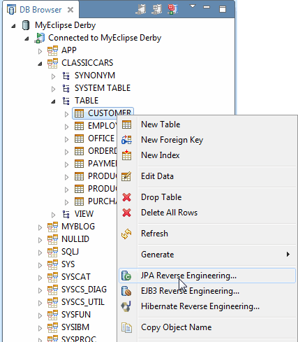 右鍵單擊一個JPA項目,然后從菜單中選擇“Generate Entities & DAOs”。您可以選擇使用MyEclipse逆向工程工具或DALI實體生成器進行選擇,將啟動相應的JPA逆向工程向導。