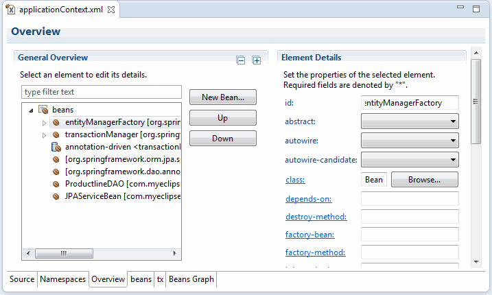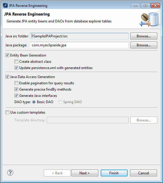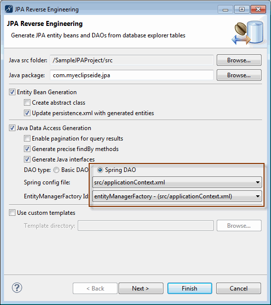 對于配置為支持高級Spring-JPA功能的項目,除了從數據庫架構生成實體類之外,還可以生成與Spring兼容的DAO。在逆向工程過程中,將使用每個DOA類的生成的bean條目更新Spring應用程序上下文文件。