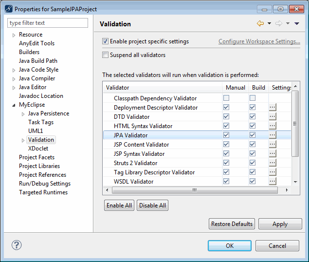 可以在項目級別啟用或禁用JPA Entity Validator。
