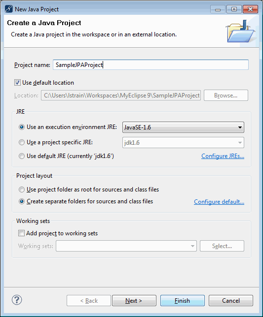在“Project Name”字段中輸入SampleJPAProject,選擇默認選項,然后單擊“完成”。