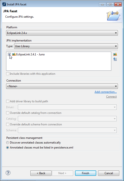 注意:在建立數據庫連接之前,無法添加JPA Facet,因為需要選擇要使用的連接。