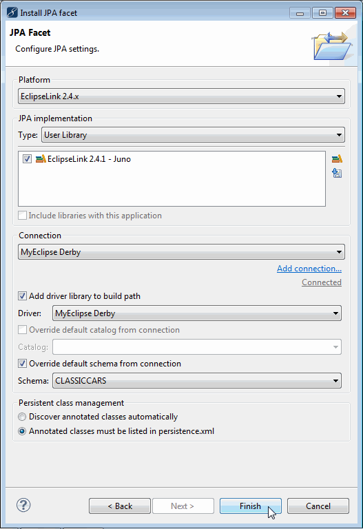 在“Connection”字段中選擇MyEclipse Derby,選中“Add driver library to build path”和“Override default schema”復選框,然后從“Schema”下拉列表中選擇CLASSICCARS。單擊完成。