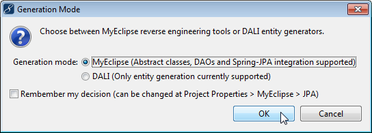 注意:您可以選擇使用MyEclipse逆向工程工具或DALI實體生成器。選擇,單擊“確定”,然后完成向導。本教程使用MyEclipse逆向工程工具。