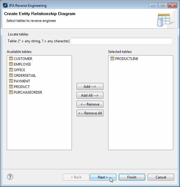 選擇PRODUCTLINE表,單擊添加,然后單擊下一步。