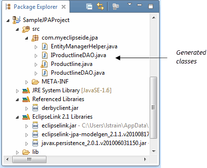 單擊完成。查看通過展開com.myeclipseide.jpa包生成的MyEclipse資源。