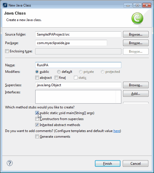 在“Name”字段中鍵入RunJPA,選中Public static void main復選框,然后單擊“Finish”。