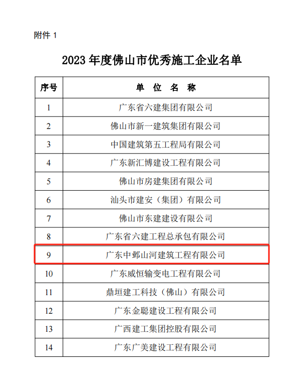 近日,經(jīng)評選委員會評選公示,根據(jù)《關(guān)于公布2023年度佛山市建筑業(yè)優(yōu)秀企業(yè)和先進個人評選活動的通知》,廣東中鄴山河建筑工程有限云開平臺登錄頁面·(中國)官方網(wǎng)站榮獲“2023 年度佛山市優(yōu)秀施工企業(yè)”稱號。