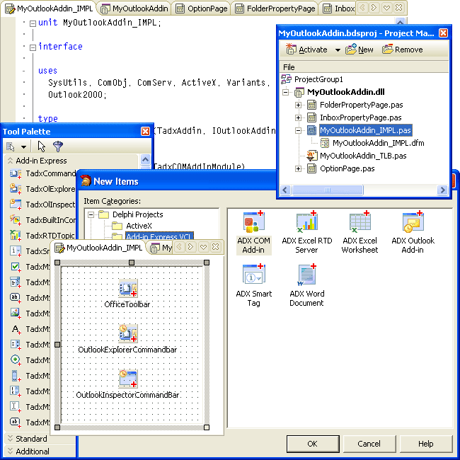 Add-in Express VCL is the first visual tool for writing a COM add-in, smart tag and RTD server in Delphi. It completely supports these technologies and makes them very comfortable for programming extensions for all available Microsoft? Office versions across 2000 through Microsoft Office 2010.