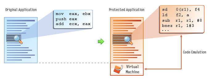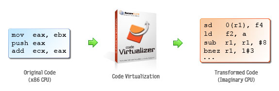 Code Virtualizer will convert your original code (Intel x86 instructions) into Virtual Opcodes that will only be understood by an internal Virtual Machine. Those Virtual Opcodes and the Virtual Machine itself are unique for every protected application, avoiding a general attack over Code Virtualizer.