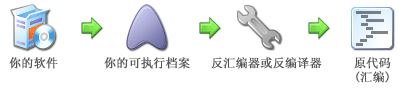 當(dāng) 一個軟件破解者嘗試破解一個編譯過的程序時,他會使用反 編譯器 具將機(jī)器語言代碼反 編譯 成另一種更容易讓人明白的代碼(例如 匯編語言 或者一種更高級的 程序語言 ),然后對于這反 編譯 成的語言進(jìn)行研究。