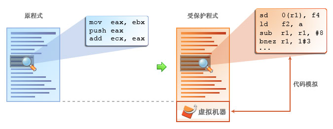 下圖展示了一個原來 編譯過的程序(在還沒有受保護(hù)時)以及當(dāng)它被 Code Virtualizer 保護(hù)時所經(jīng)過的 轉(zhuǎn)變。