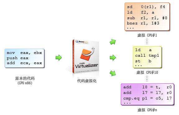 Code Virtualizer 將你源代碼(Intel x86 指令)轉(zhuǎn)化成虛擬的指令,只有內(nèi)部的虛擬機(jī)器可以明白這些指令。對于每一個所保護(hù)的程序,這些所產(chǎn)生的虛擬指令以及虛擬機(jī)器本身都是獨(dú)特的,以防止他人對 Code Virtualizer 采用廣泛的攻擊。