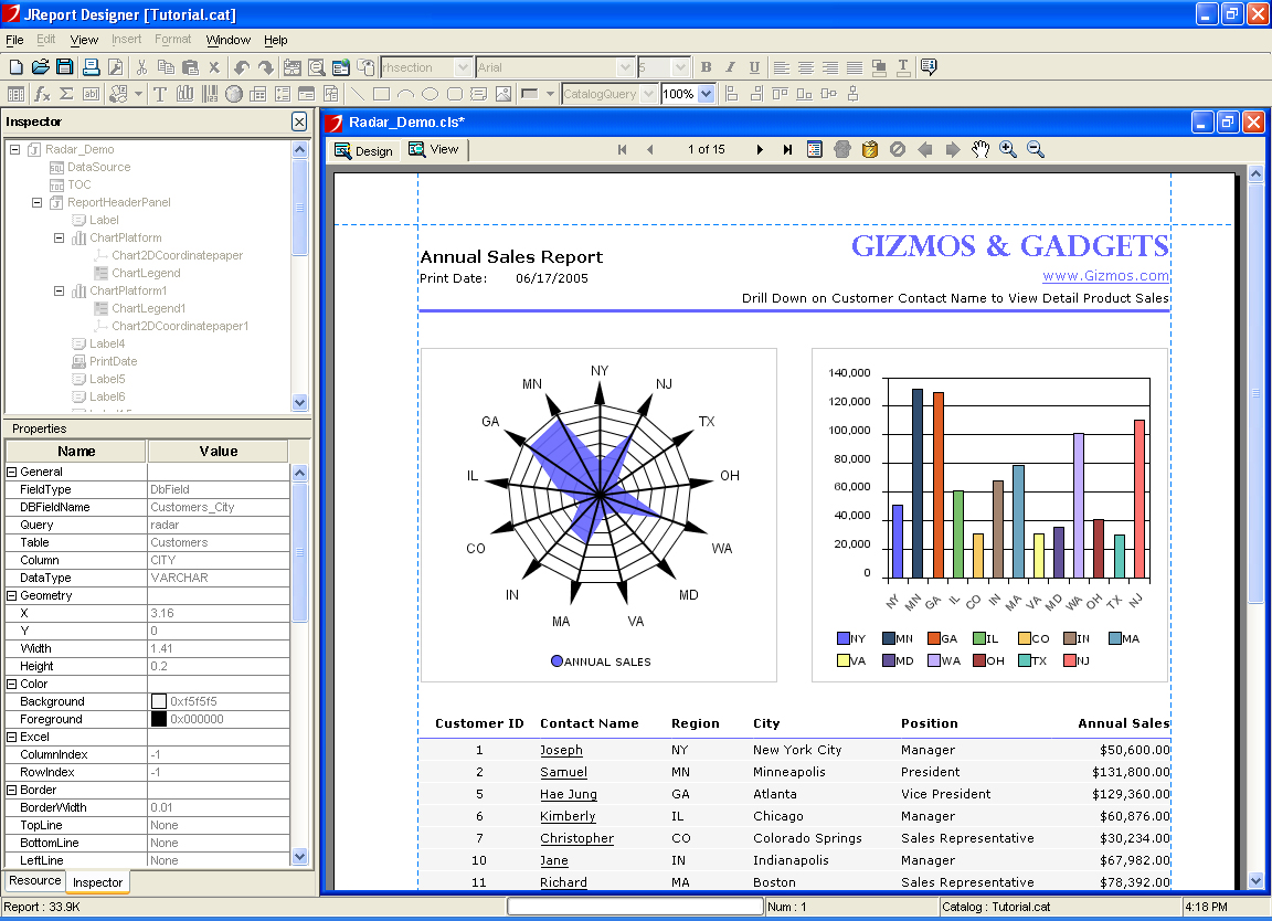 設計直觀的報表JReport Designer界面功能豐富,能設計精致的報表。直觀的向導可以引導開發人員選擇數據源、創建查詢和設計布局。設計器能精確控制報表的每一個部分,確保數據有更強的可讀性,與當前的設計原則相吻合。而且,設計器支持CSS樣式,允許運行時應用CSS樣式表,為用戶定制報表格式。 | ![]() |