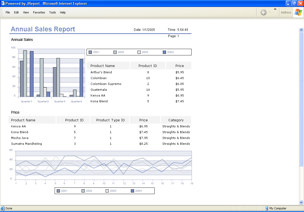 ![]() | 輕松制作圖表 JReport Designer的圖表制作向導使制作復雜圖表過程不再困難。它提示設計者選擇數據,排序,分組,及格式模式。JReport Designer將根據所選設置模式自動生成圖表。JReport包含超過40個二維及三維圖表類型,并且能以圖形或動態的applets模式進行預覽。所有的JReport圖表都是能動的;用戶可以向不同方向拖動圖表來預覽相關的內容及數據。 |
