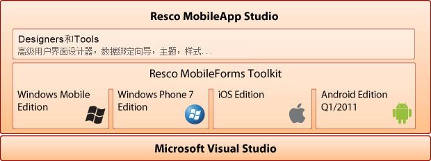 Resco MobileApp Studio is a Microsoft Visual Studio based developer platform, which can be used for development of mobile applications for multiple mobile device types — Windows Mobile, Windows CE, Tablet PC, Windows Phone 7, iPhone, iPad and Android (Android support is scheduled for Q1 2011). It consists of suites of User Interface controls for WinForms, Silverlight, MonoTouch and MonoDroid together with advanced designers and tools allowing developers to quickly design and build mobile forms. Since all the controls and tools are integrated with Microsoft Visual Studio, they can be easily accessed and used from this familiar development environment using programming languages, such as C# or Visual Basic .NET.