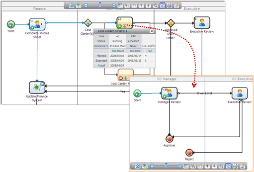 BizFlow超出了簡單的圖形化的流程工作項的顯示。工人和管理人員可以很容易地從一個流程圖發現重要的處理細節,如已用時間,在截止日期之前認為完成的實例,以及在處理的實例總數。