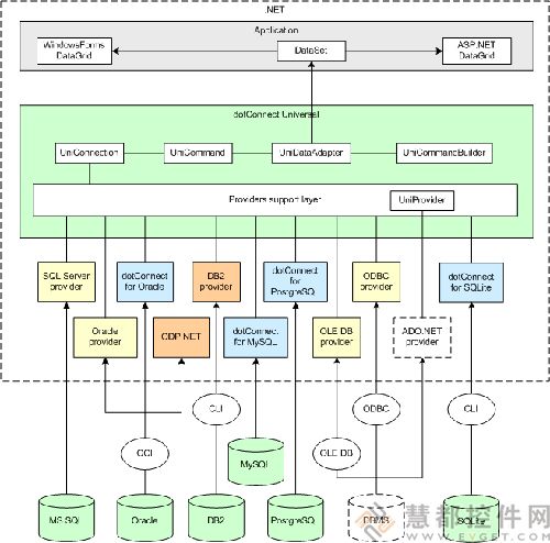以下的圖表展示了dotConnect Universal 的結構。綠色部分表示一些dotConnect Universal組件,灰色面積部分表示在專業版中的提供程序。其余部分表示.NET Framework的內部和外部訪問元素。