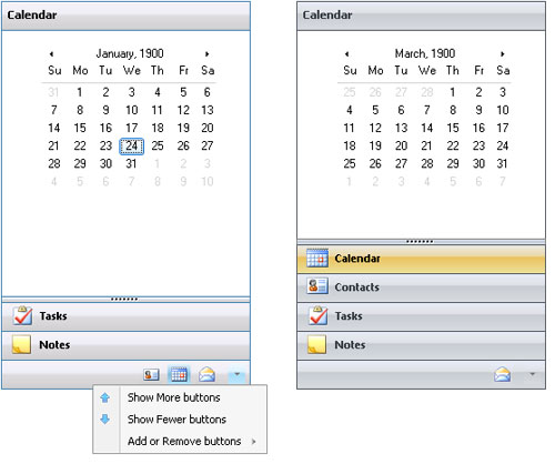 Outlook風格的導航面板在功能上與Outlook 2010和2007導航條類似,其是創建Office風格用戶界面的理想選擇。VIblend Outlook風格的導航面板允許用戶通過拖動柄分離器改變可見的群組數目。用戶也可通過在底部顯示的按鈕面板查看隱藏的分組,還可通過點擊處于導航面板底部右邊角落里的箭頭,使用內置的菜單對控件進行自定義。 | ||||||||||||||||||
