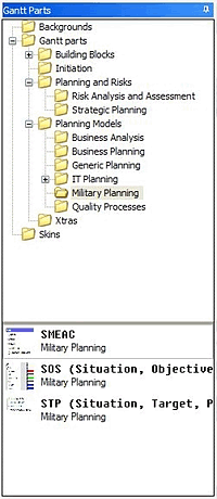 You'll find Gantt parts included for Six Sigma, Military Missions (SMEAC), Naval Situation Analysis (SOS), Risk Analysis, Extreme Programming, Strategic Planning, Project initiation and MANY more...