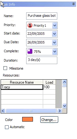 Floating property panes let you use your mouse to enter task priority, date information, percent done without ever waiting for a dialog to popup.