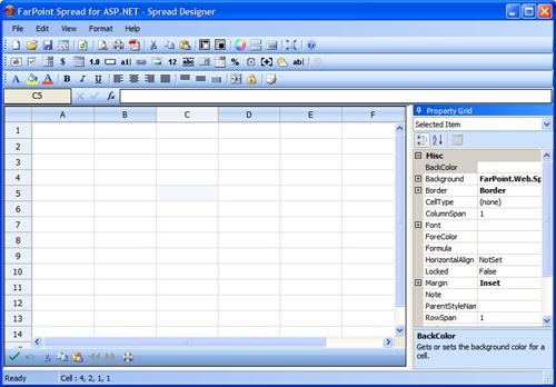 You can easily assign cell types, color, text, etc for any cell using the Spread Designer’s unique WYSIWYG implementation. This allows for faster design of your applications by your developers or you can even give the Spread control to your graphic designers to configure and create “skins?Ethat can be used across multiple spreadsheets or even across multiple applications for a consistent look. Below is a screenshot of the Spread Designer: