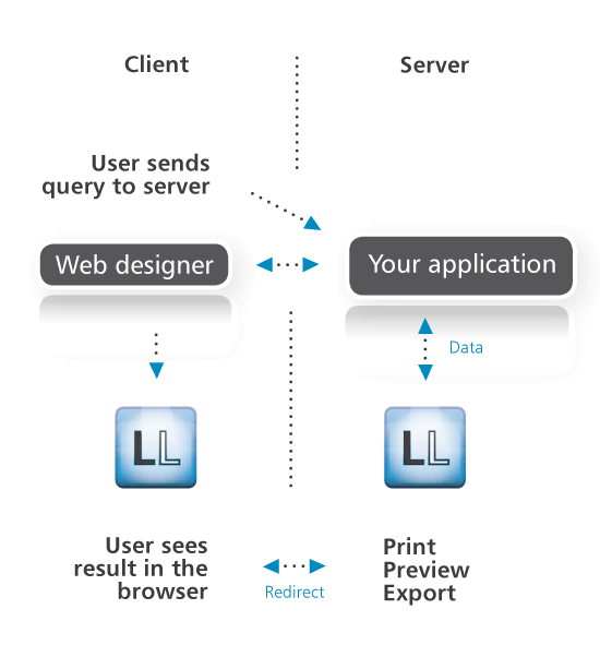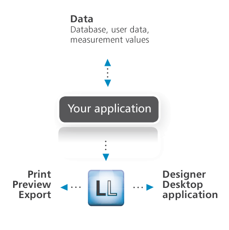 傳統(tǒng)桌面應用程序:: 數據庫(用戶的應用程序將數據傳送至List & Label)或者通過.NET, Delphi, C++ Builder完成數據綁定. ![]() | 服務器或者Web服務器應用程序: 用戶僅需在起Web應用程序中計劃設置一個接口以創(chuàng)建報表。在企業(yè)版中我們提供了為服務器和web服務器應用程序定制的無限制運行時授權! ![]() |
