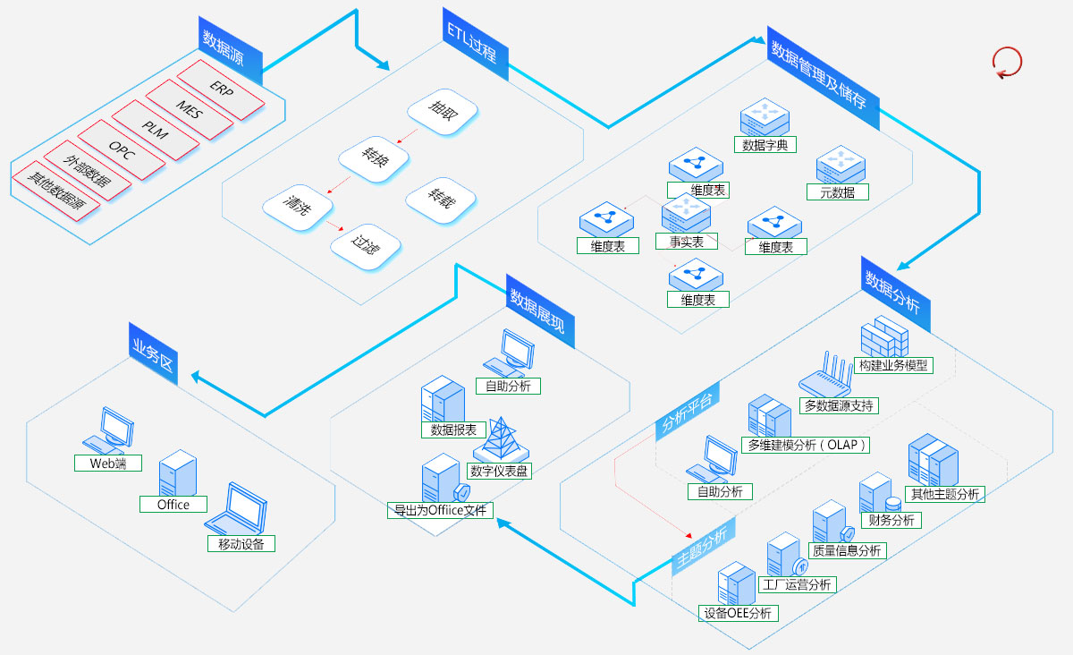 慧都對智能制造的推行提供可視化的輔助手段,對企業(yè)管理決策提供有力的分析工具,整合各業(yè)務(wù)模塊數(shù)據(jù),建立高效、統(tǒng)一、共享的生產(chǎn)制造數(shù)據(jù)分析平臺。